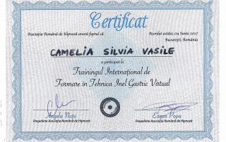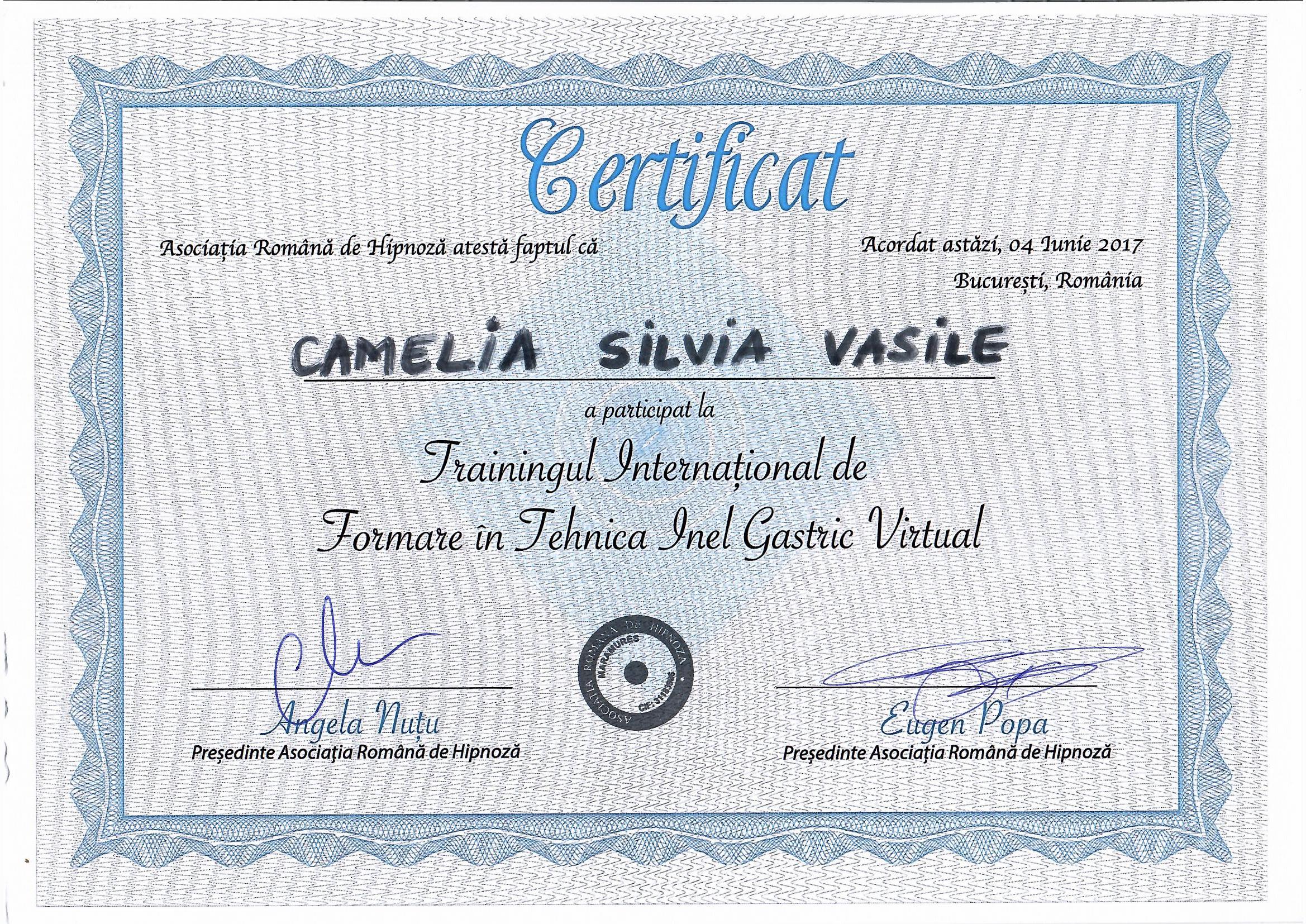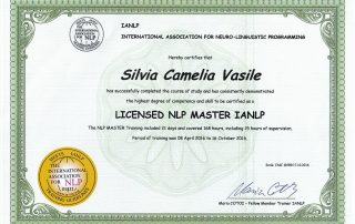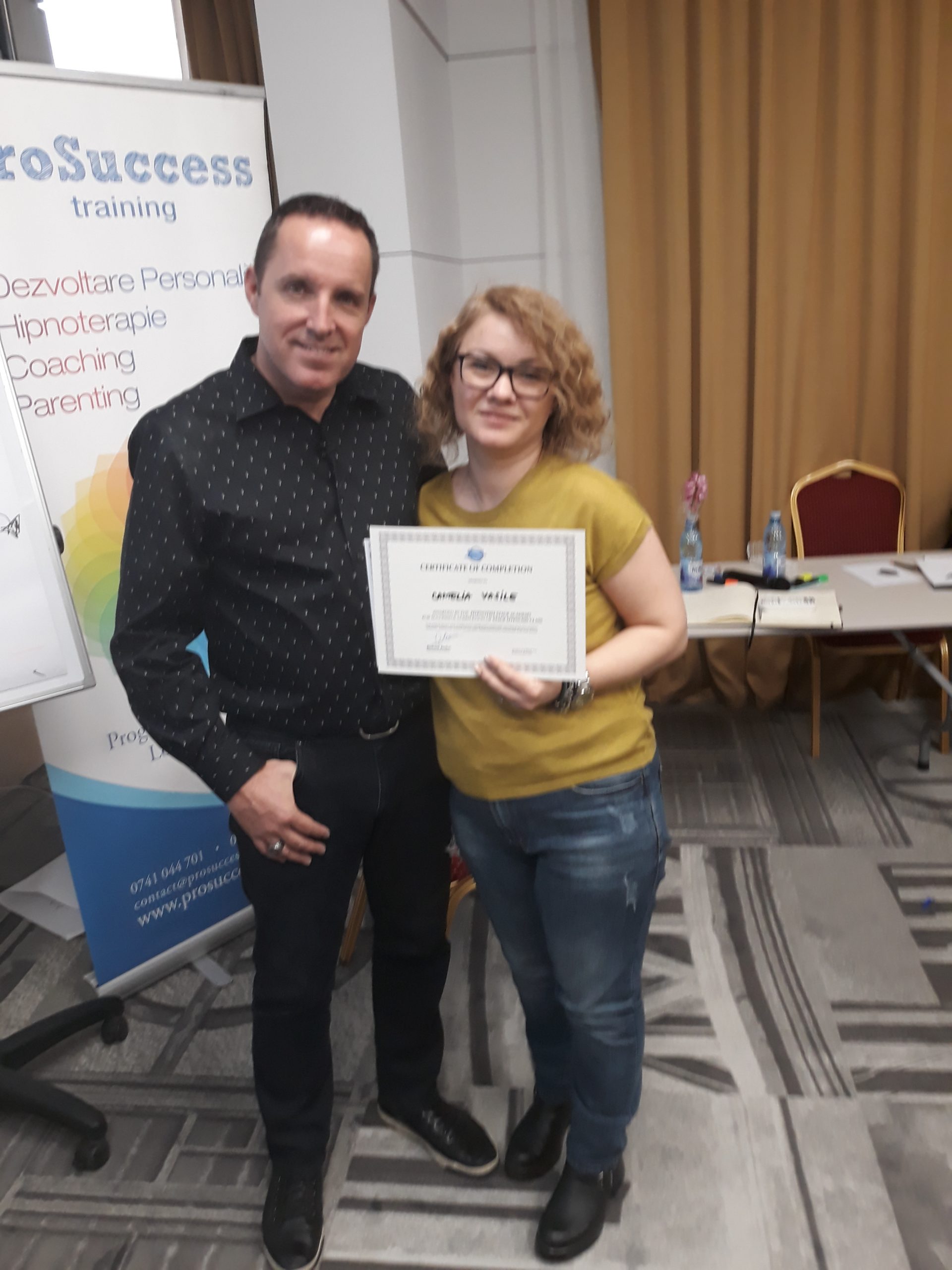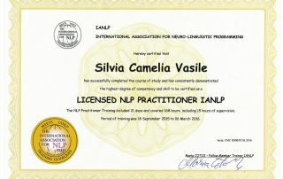 Am facut cele 2 module de Programarea Neuro-Lingvistica fiind Master NLP la finalul anului de studiu, am facut training-uri de Autohipnoza, Procesul Goulding SleepTalk® pentru Copii creat de Joane Goulding (hipnoza la copii in timpul somnului) si ultima acreditare internationala de care sunt tare mandra pentru ca am aplicat-o pe propria-mi piele; Inelul Gastric Virtual impreuna cu Sheila Granger care este chiar creatoarea tehnicii, una dintre cele mai inovative modalitati de control al greutatii.