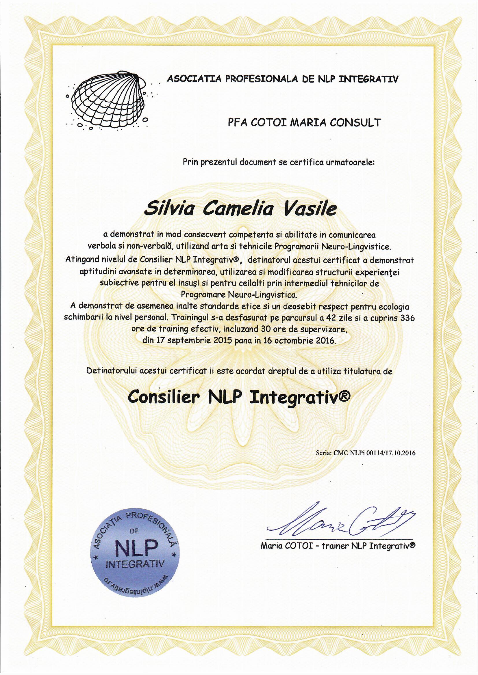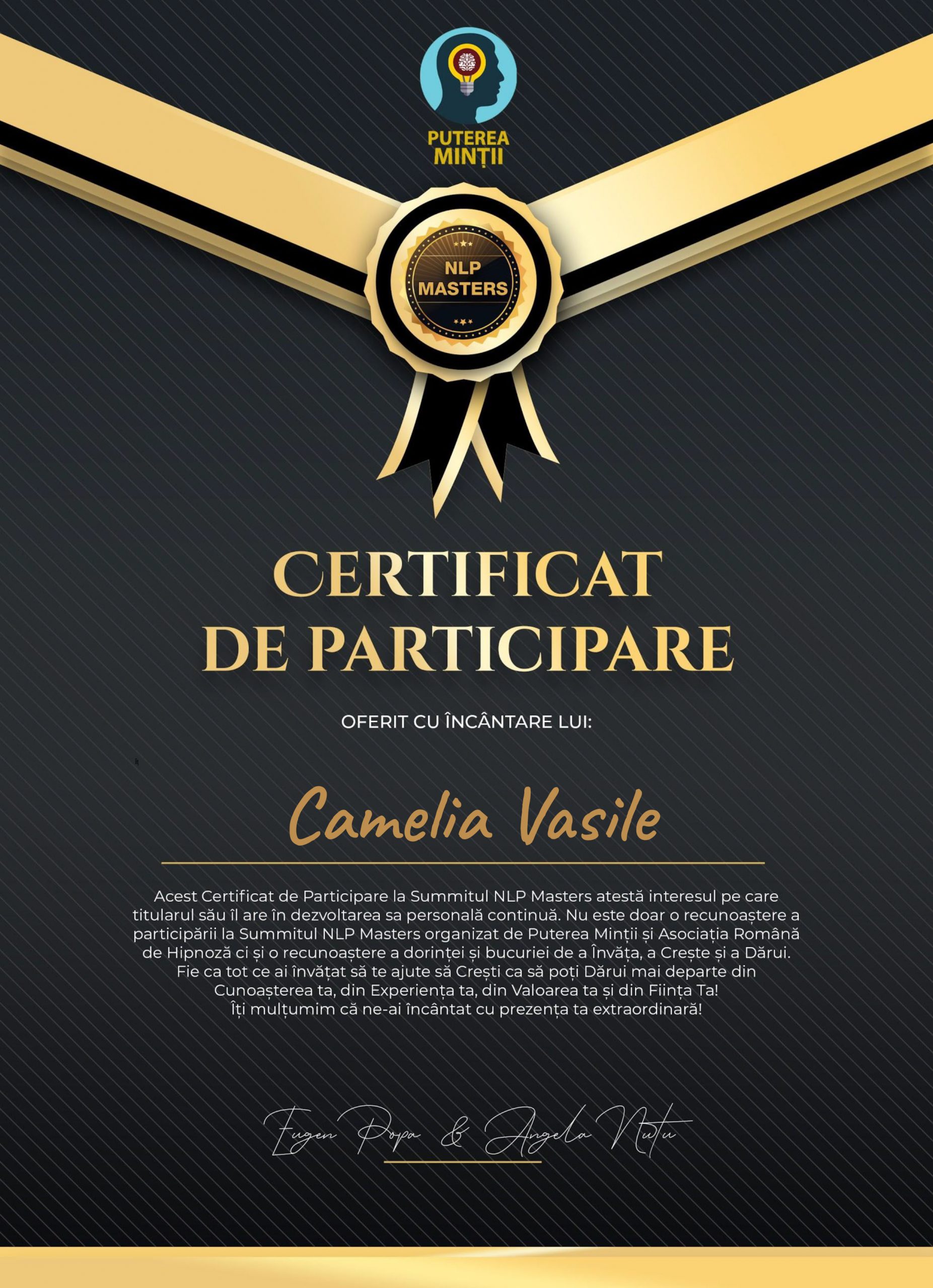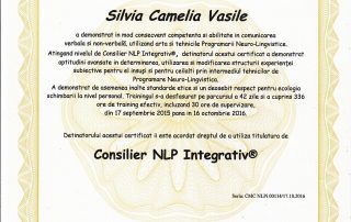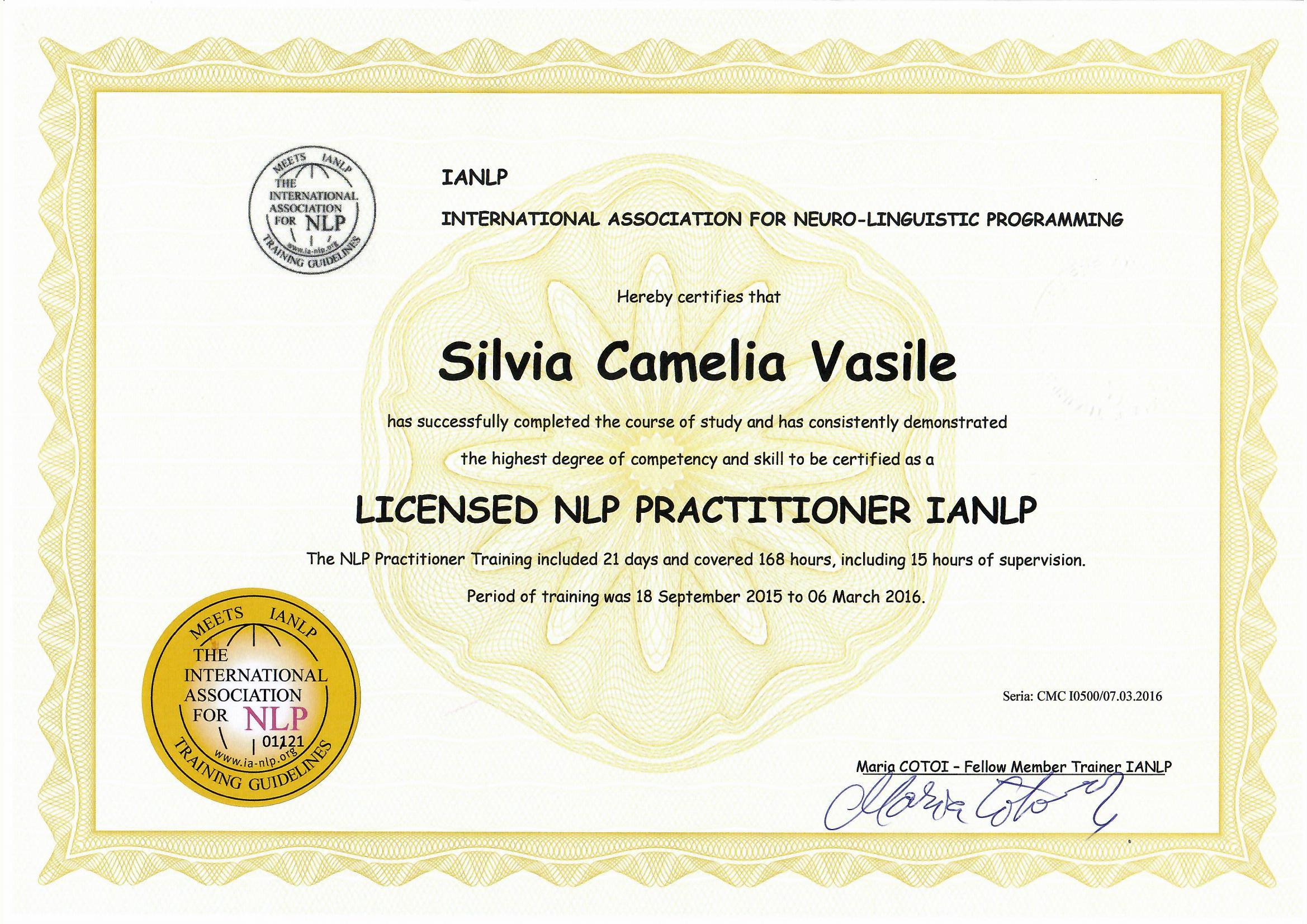 Am facut cele 2 module de Programarea Neuro-Lingvistica fiind Master NLP la finalul anului de studiu, am facut training-uri de Autohipnoza, Procesul Goulding SleepTalk® pentru Copii creat de Joane Goulding (hipnoza la copii in timpul somnului) si ultima acreditare internationala de care sunt tare mandra pentru ca am aplicat-o pe propria-mi piele; Inelul Gastric Virtual impreuna cu Sheila Granger care este chiar creatoarea tehnicii, una dintre cele mai inovative modalitati de control al greutatii.
