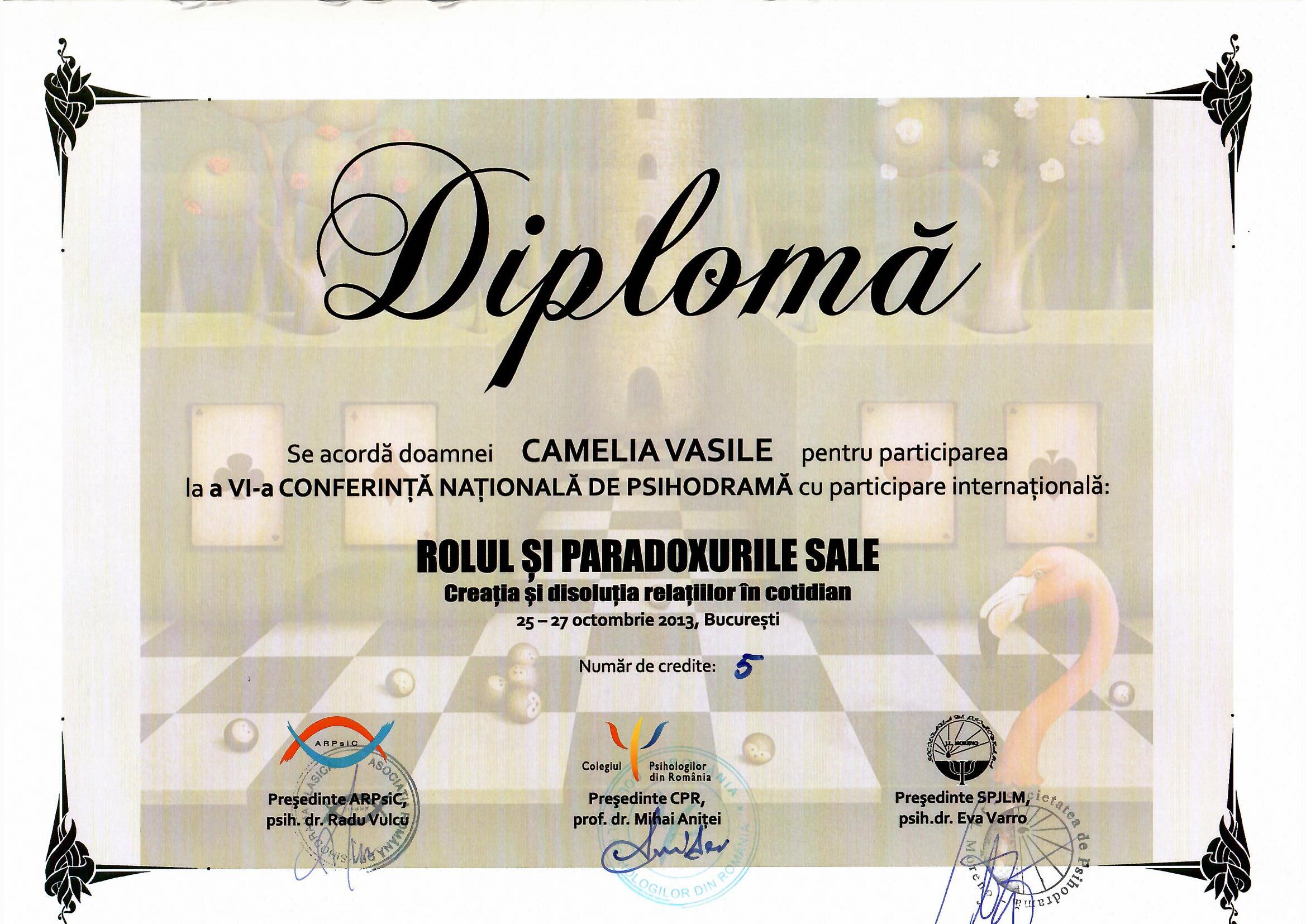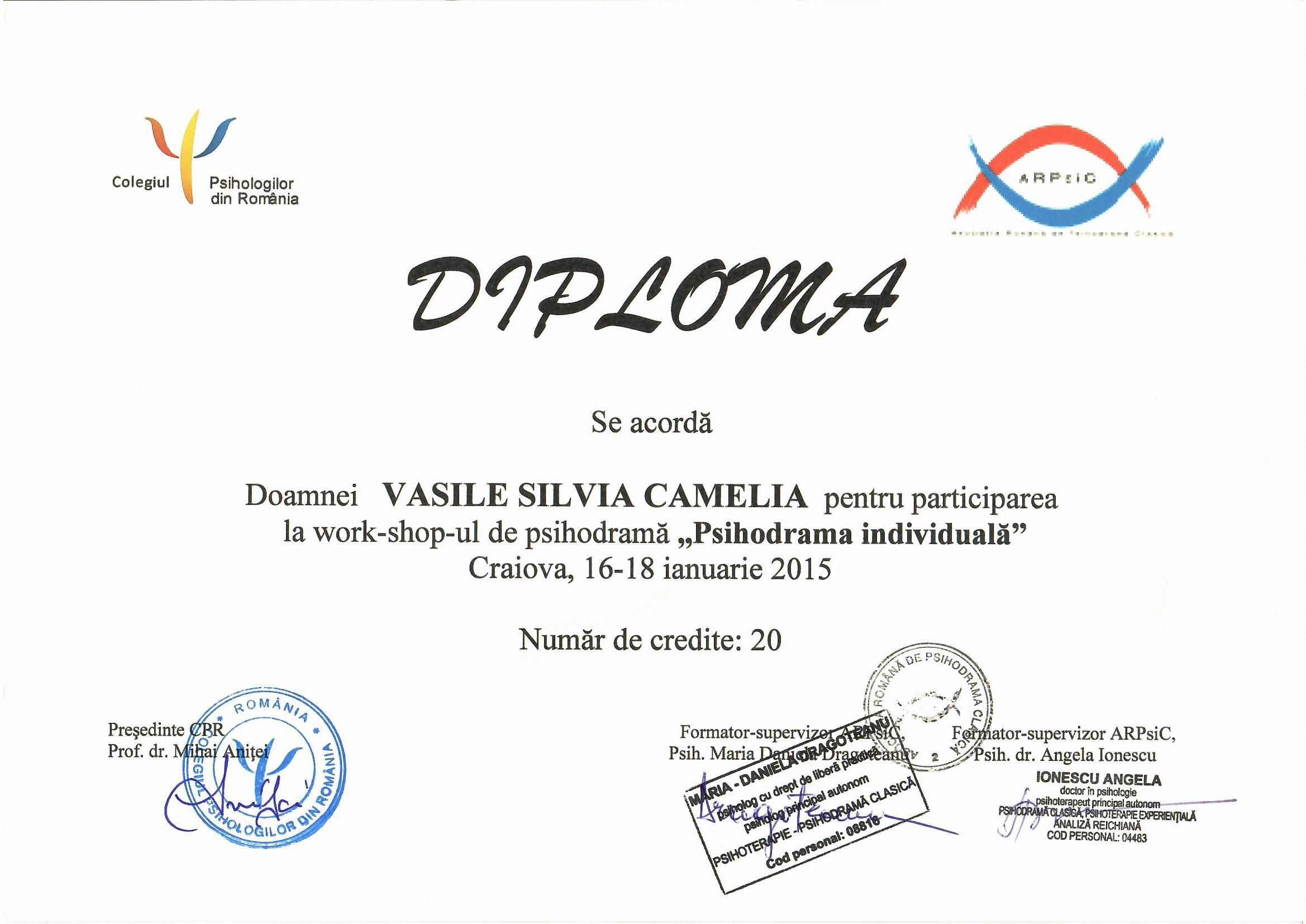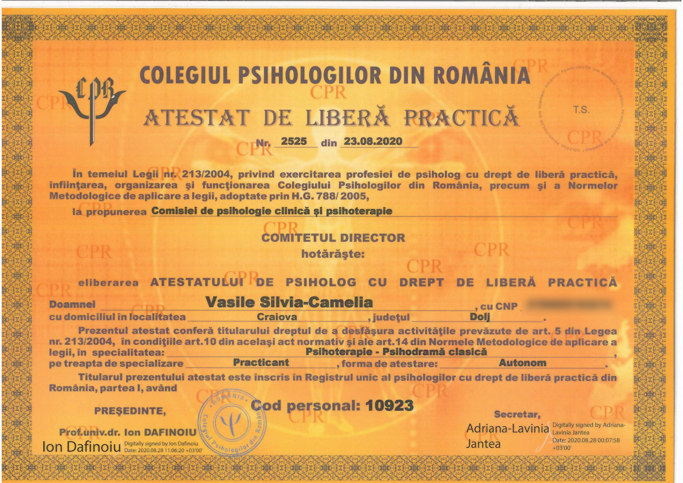 • Atestat libera practica- psihoterapie-psihodrama clasica – acreditat de Colegiul Psihologilor din Romania;