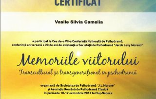 - Conferinta Nationala de Psihodrama, Cluj-Napoca 2014 – “Memoriile viitorului – transcultural si transgenerational in psihodrama”;
