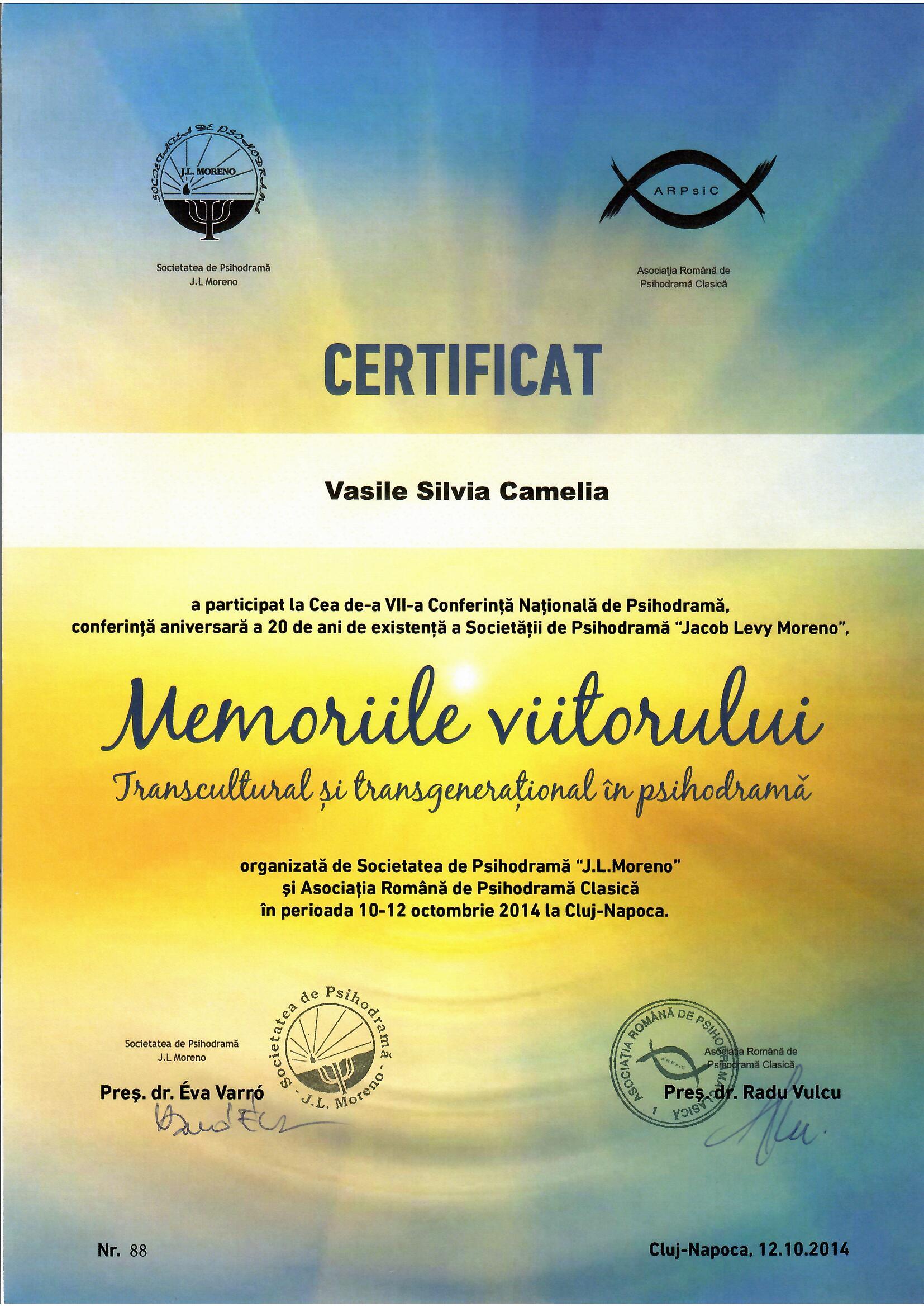 • Conferinta Nationala de Psihodrama, Cluj-Napoca 2014 – “Memoriile viitorului – transcultural si transgenerational in psihodrama”;
