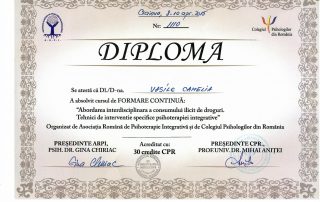 - Curs de formare continua acreditat Colegiul psihologilor din Romania – “Abordarea interdisciplinara a consumului ilicit de droguri. Tehnici de interventie specifice psihoterapiei integrative”;