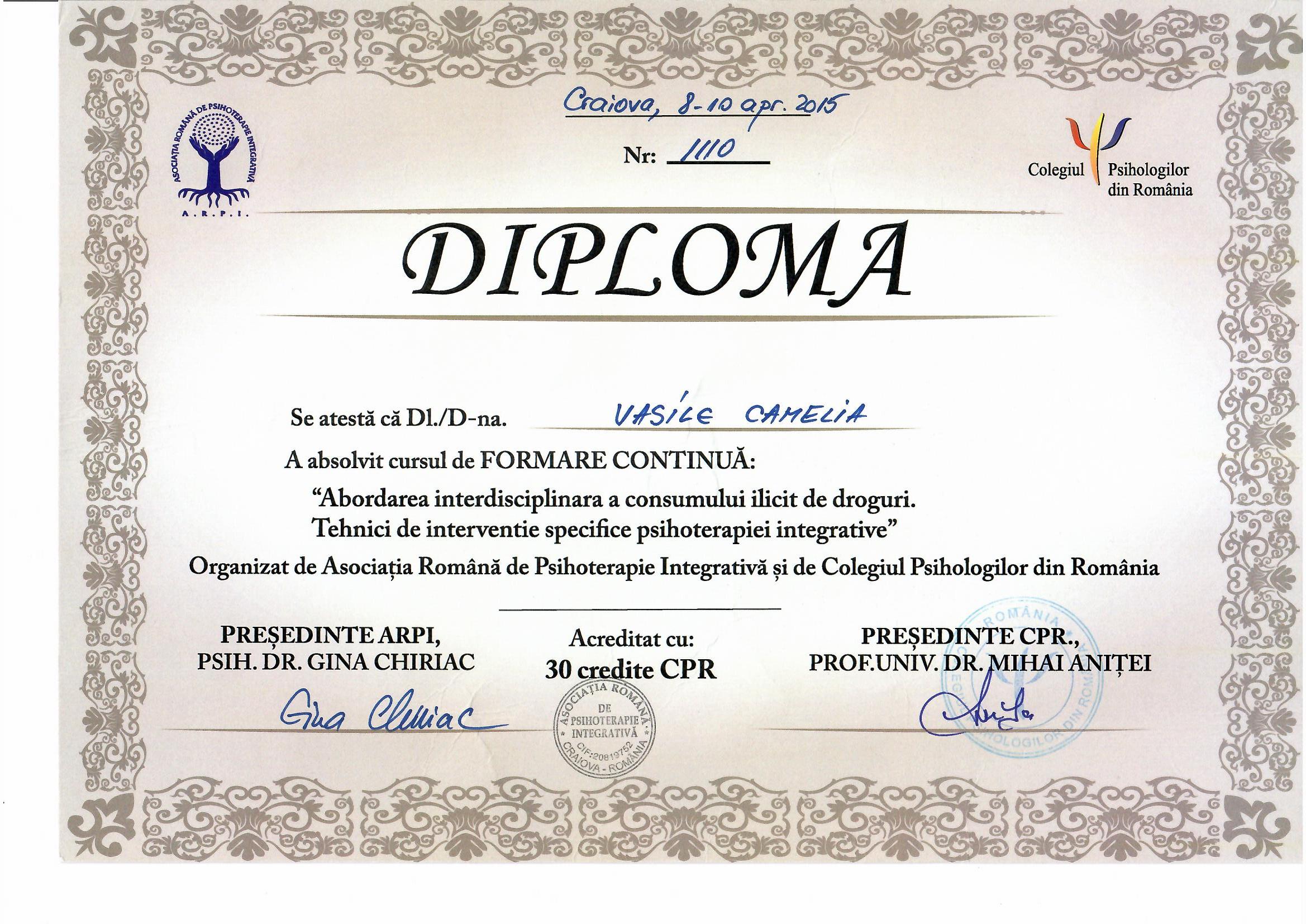 • Curs de formare continua acreditat Colegiul psihologilor din Romania – “Abordarea interdisciplinara a consumului ilicit de droguri. Tehnici de interventie specifice psihoterapiei integrative”;