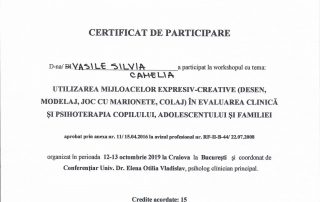 - Workshop acreditat Colegiul psihologilor din Romania, Elena Otilia Vladislav – “Utilizarea mijloacelor expresiv-creative in evaluarea clinica si psihoterapia copilului, adolescentului si familiei”;
