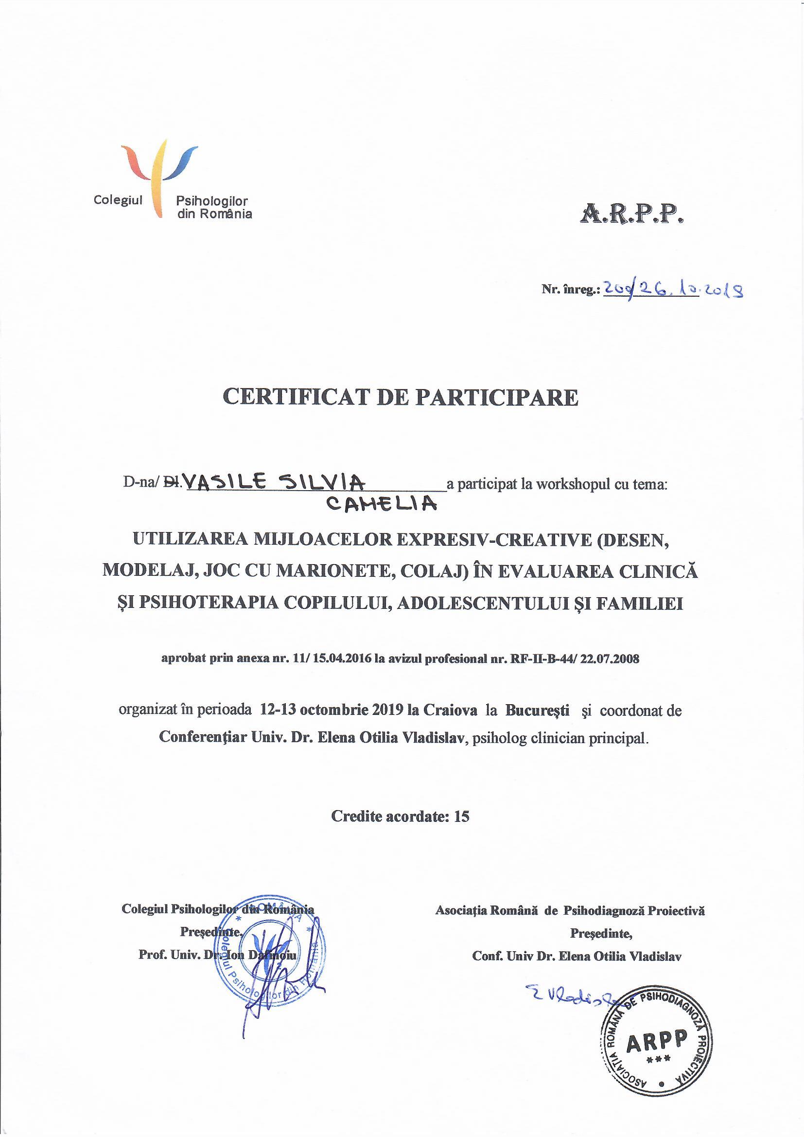 • Workshop acreditat Colegiul psihologilor din Romania, Elena Otilia Vladislav – “Utilizarea mijloacelor expresiv-creative in evaluarea clinica si psihoterapia copilului, adolescentului si familiei”;