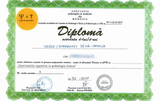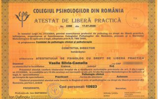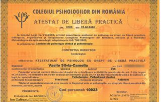 - Atestat libera practica- psihologie clinica– acreditat de Colegiul Psihologilor din Romania;