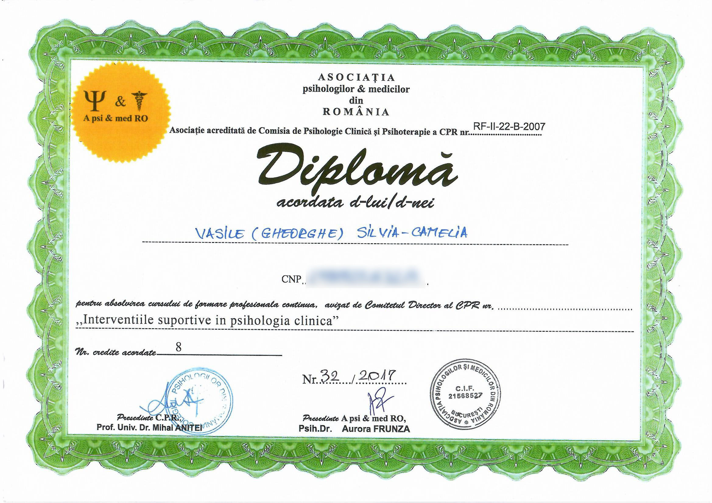 • Curs formare continua acreditat de Asociatia Psihologilor si Medicilor din Romania, Psih. Dr. Aurora Frunza – “Interventiile suportive in psihologia clinica”;