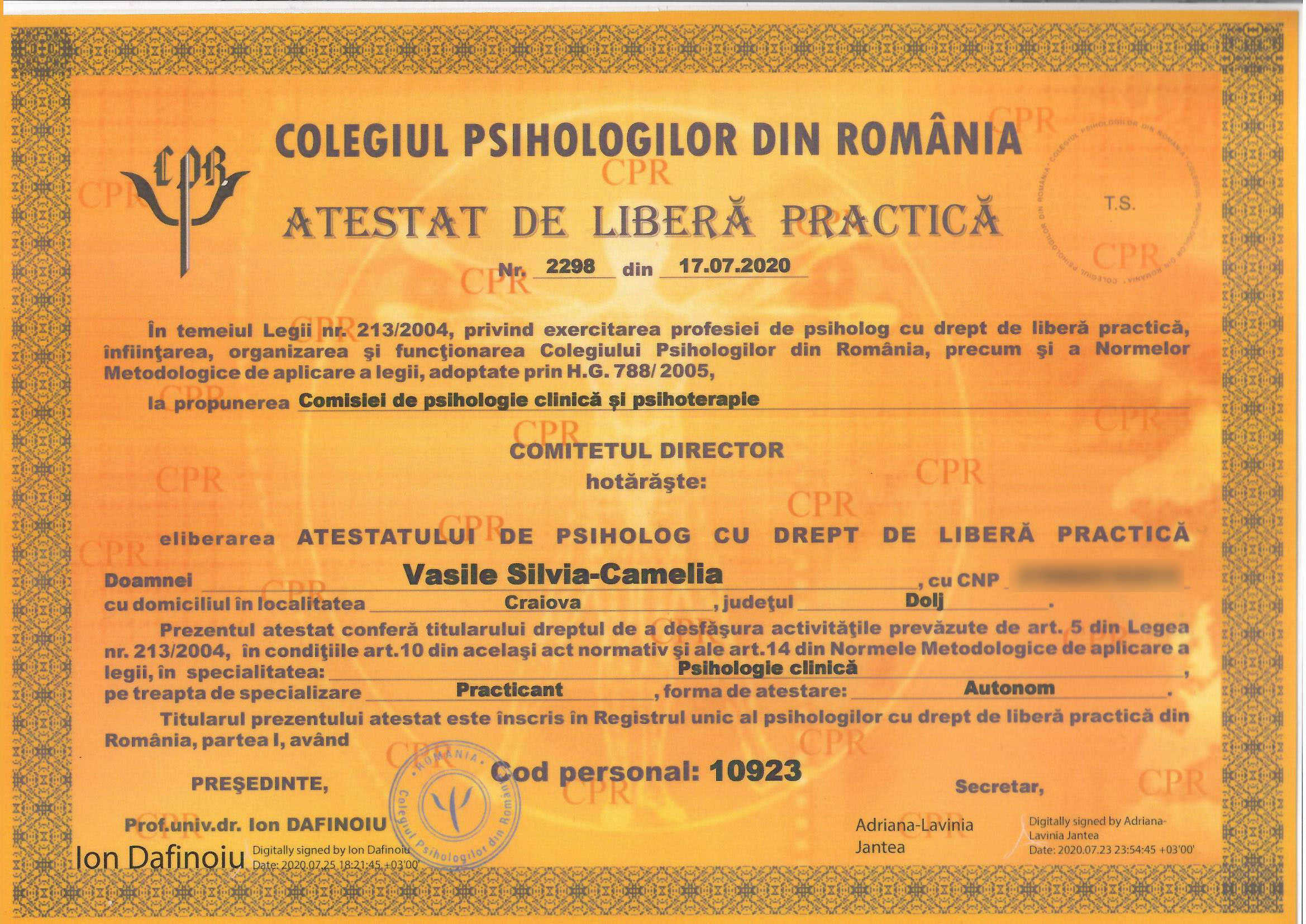 • Atestat libera practica- psihologie clinica– acreditat de Colegiul Psihologilor din Romania;